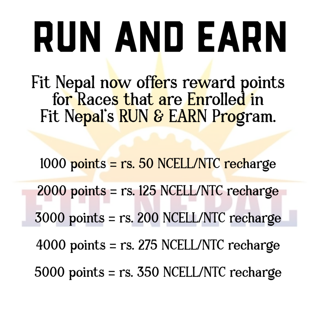Starting from 1000 and all the way to 5000 points you are able to redeem rewards for rs. 100 to rs. 700 recharge card for FREE, for your dedication to ULTRA running sports. see below for points and rewards allocation. Any unused points will roll over any remaining reward points in runner’s Fit Nepal App account.